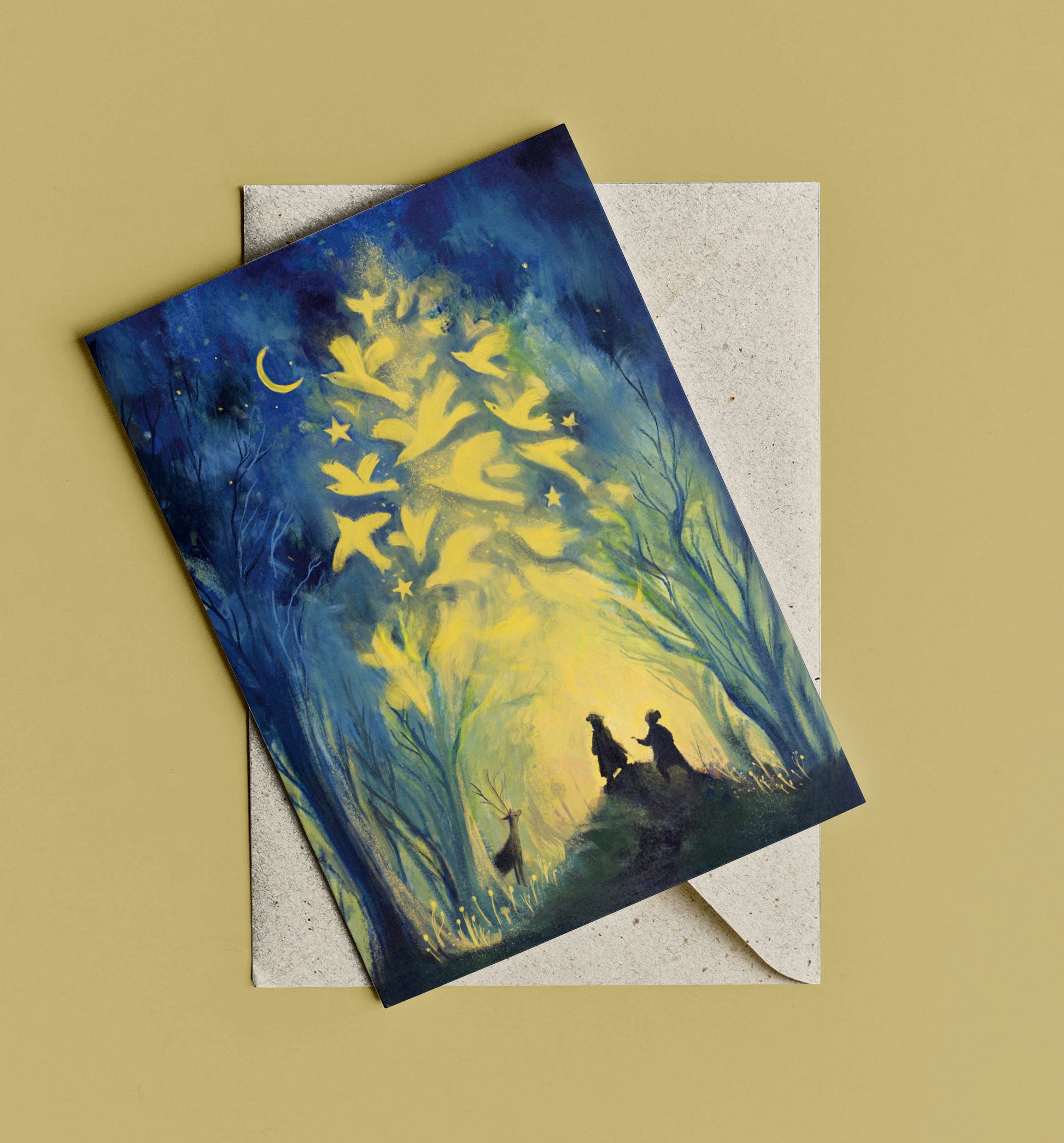Laat je meenemen in de stilte van het bos met deze bijzondere kerstkaart, gebaseerd op een zelfgemaakte illustratie. Elk detail werd met liefde getekend.